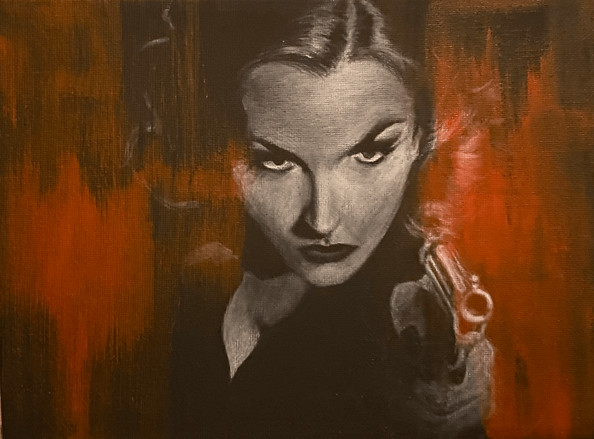 Using the classic noir palette of black, white, and red, I create narratives with white strokes of acrylic on black canvases. The stark contrasts and deep shadows are more than just aesthetics—they reflect the layers of these women’s lives, inviting you to see beyond the surface.